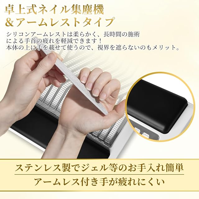 【ネイルダスト対策&静音設計】ネイルダストは主にジェルネイルをオフする際に多く発生する粉塵です。施術中やサンディングの際に発生する空気中のダストを集め、さらに匂いも吸引出来、ジェルを塗布の際や未硬化の時にほこりやゴミなどの入り込みを防ぎます。作動中でも音が静かなので、低騒音を具現、ストレスを感じることなく施術ができます。お客様との会話やリラックス空間を妨げません。
