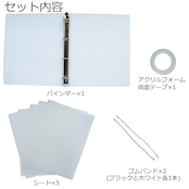 ネイルチップの収納に便利なバインダーです。ネイルチップのホコリやキズを防止する機能性も兼ね備えています。セット内容はバインダー×1、シート×5、ゴムバンド×2、アクリルフォーム両面テープ×1になります。※ネイルチップ、シール等は撮影用です、付属しておりません。