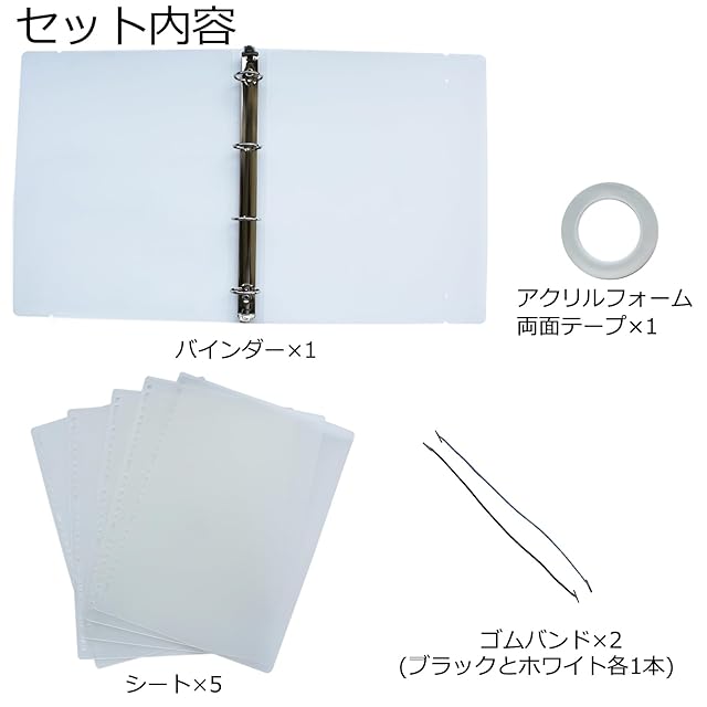 商品情報 「材質」 バインダー:ポリプロピレン、鉄 シート:ポリプロピレン 両面テープ:アクリルフォーム 「サイズ」 バインダー:幅26cm×長さ32cm×厚さ4cm シート:幅22.2cm×長さ30cm 両面テープ:幅15mm×厚さ1mm×長さ5m 「セット内容」 バインダー×1、シート×5、ゴムバンド×2、アクリルフォーム両面テープ×1 「注意事項」 ※ネイルチップ、シール等は撮影用です、付属しておりません。 ※ネイルチップの収納可能数は貼り方によって異なります。