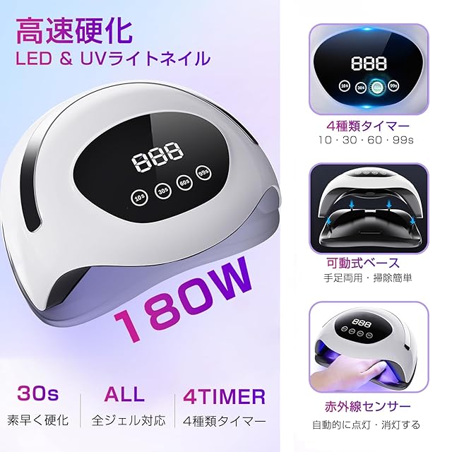 【素早く硬化】180WのLED&UVネイルライトは、UVとLED二重光源を備えており、照射波長365nm+405nmで、180°均一に分布されており多面へ照射出来るので従来の紫外線ネイルライトより素早いに硬化できます。