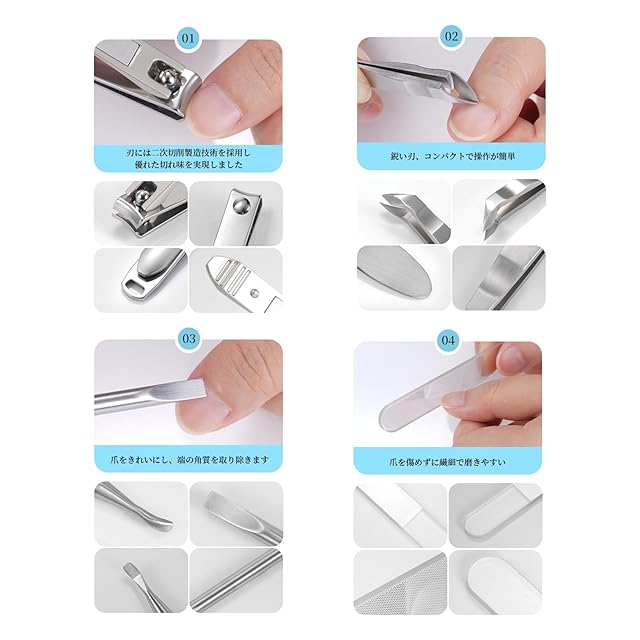 【多用途】:セットの爪切りと爪やすりは爪のトリミングと磨きに使用し、キューティクルニッパーとプッシャーは爪の周りの角質や汚れのトリミングとクリーニングに使用します。毎日のネイルケアのニーズを満たすことができます。