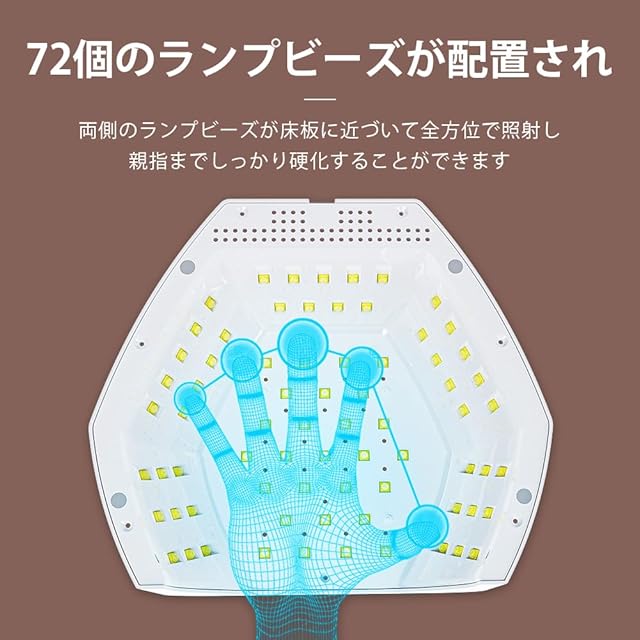 【72個のLEDと赤外線感知】72個のLEDはジェル ネイル ライトの内部に均等に配置されており、範囲内を180°全方位に照射することができます。さらに、硬化 用 uv ライトには赤外線スマート感知システムが搭載されており、自動的に点灯し、消灯します。便利で快適なネイル体験を提供します。
