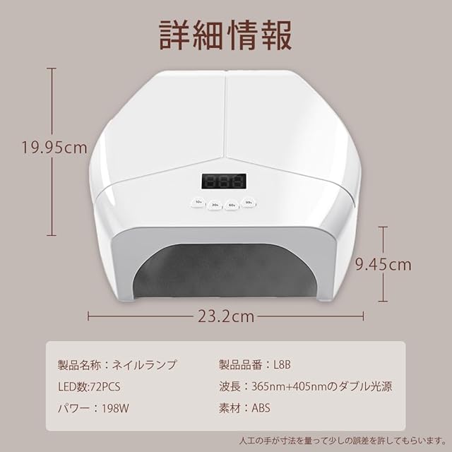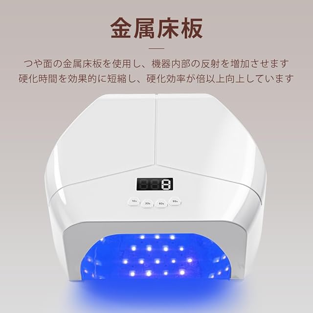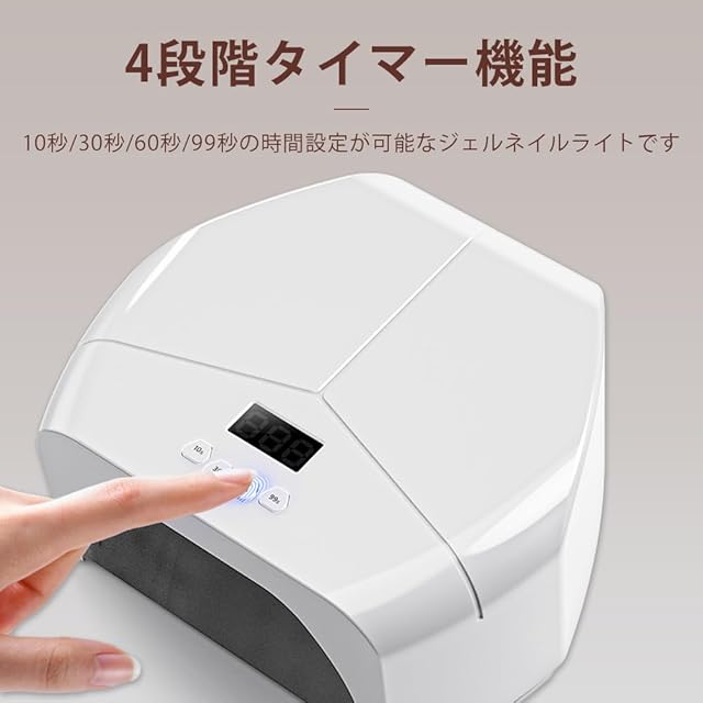 【四段階のタイマーとLCDスクリーン】uvライト ネイルは、10秒、30秒、60秒、99秒の4つの異なるタイマーをサポートしており、お好みに応じて選択することができます。軽くタップするだけで、ネイル ledライトに備えられたLCDスクリーンが残り時間を一目で表示します。