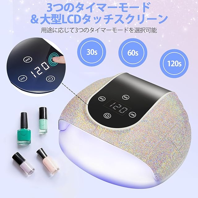 広々としたスペース:ジェルネイル ライトは取り外し可能なベースが付いており、簡単に取り外して清掃できます。また、広々としたスペースにより、5本の指やつま先の爪を同時に硬化できます。さらに、このUVライト レジンはABダイヤモンドで装飾されており、異なる光の下で様々な色を反射し、輝きと透明感を演出します