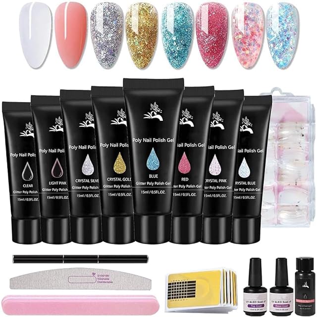 【セット内容】両頭マニキュアブラシ、ポリジェル八瓶(15ml/瓶)、ベースコート(15ml)、トップコート(15ml)ネイルブラシ専用液(30ml)、長さ出しチップ 100枚(10サイズ各10枚)、ネイルヤスリ2本(ピンクと白)、ネイルフォーム。