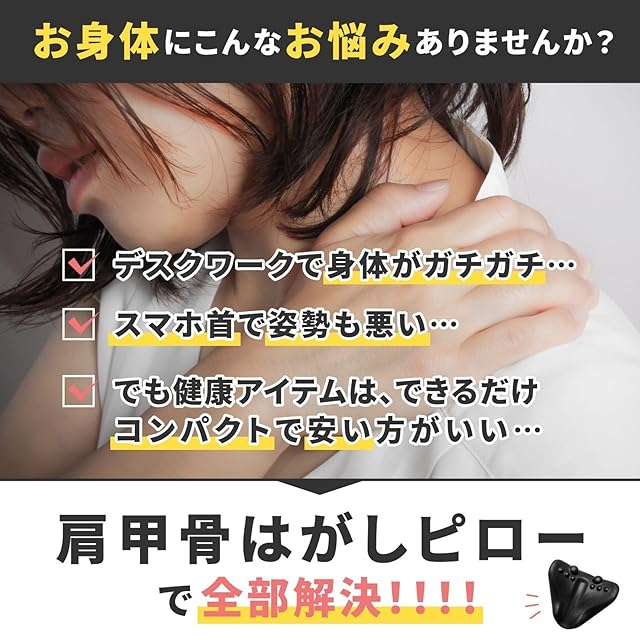 「常識を変える、新発想の肩胛骨はがし ピロー 肩甲骨はがし ピロー!」 肩こり解消グッズの常識を覆す、全身に使える【肩甲骨はがし ピロー】が登場! 後頭部・側頭部・首・肩・肩甲骨・背中・腰・お尻・もも裏・鼠径部・下腹部まで、これ1つで全身のツボ押し&マッサージが可能! コンパクト設計で場所を取らず、デザイン性も抜群。従来の“ゴツゴツした見た目”とは違い、洗練されたシャープなフォルムでインテリアにも馴染みます。 しかも圧なコスパ!今までの肩甲骨はがしでは満足できなかった方にこそ試してほしい、新しい健康グッズの決定版!