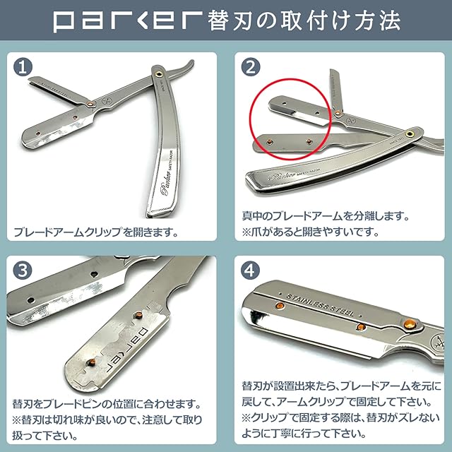 【世界で愛される剃刀】Parkerのカミソリは世界中の理髪店やシェービング店で使用されています。5つのシャークハーフブレードが付属されていますので、剃刀部分をホーニングや研ぐ必要が全くありません。