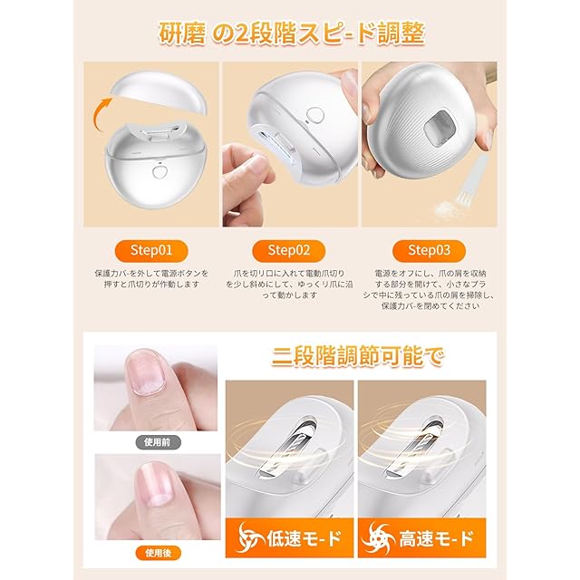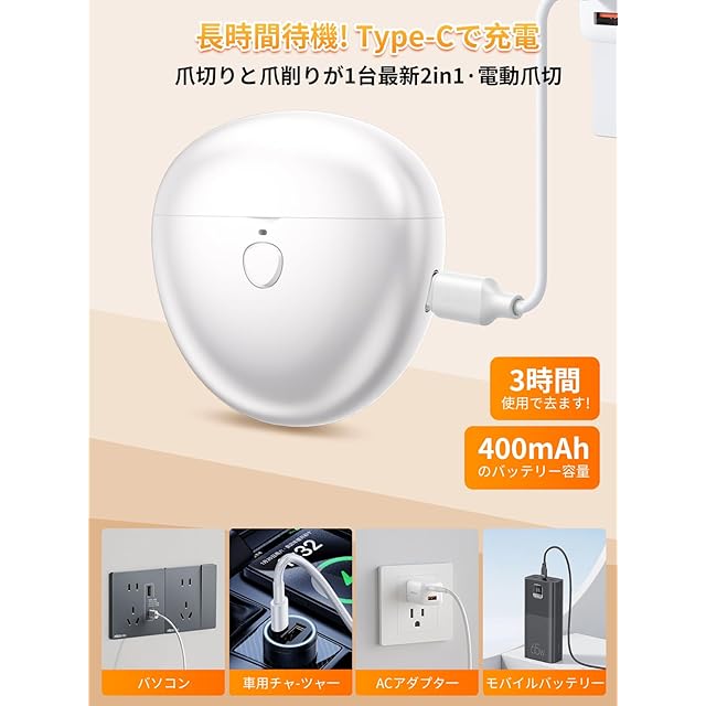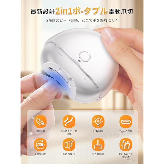 【最新設計2in1傑作】Aaphnue 電動爪切り 高級 爪切り電動 2段階スピード調整、LED照明付きで簡単操作 爪削り電動 Type-C充電式 低騒音で、コンパクトで持ち運びも簡単です ネイルケア 電動 角質ケアも可能で 子供から大人 高齢者まで幅広い年齢層に対応 (ホワイト)