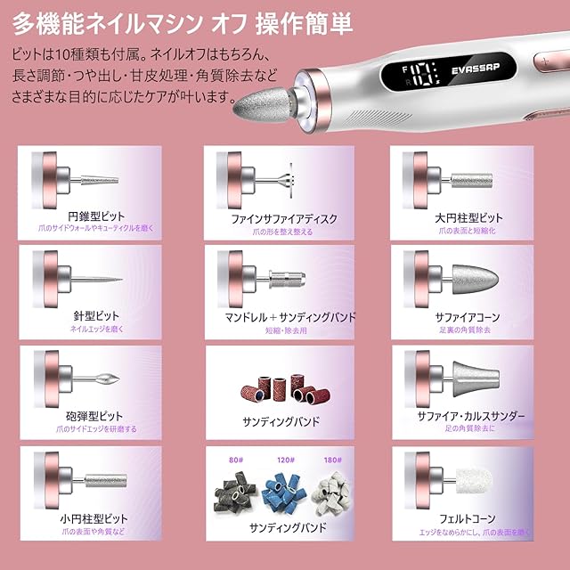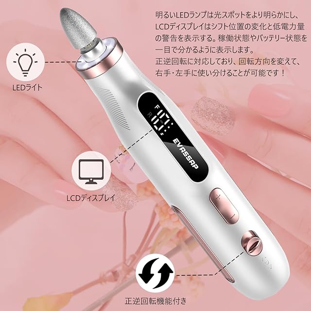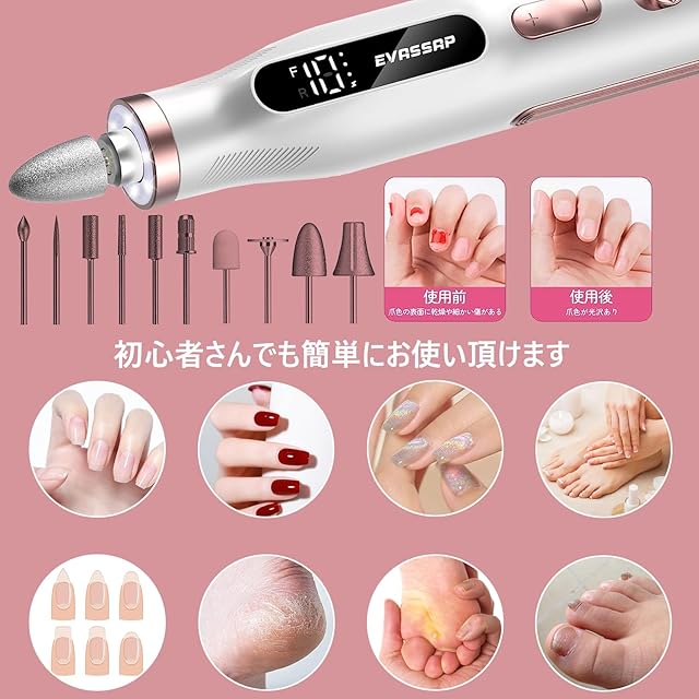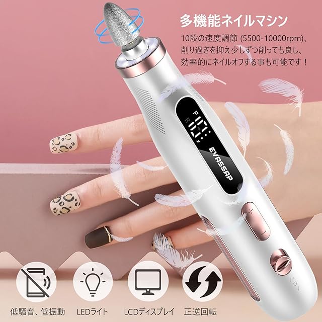 この電動ネイルマシンは、プロフェッショナルなネイルケアを自宅でも簡単に実現できる優れたツールです。爪磨き、ネイルオフ、角質除去、死皮処理など、さまざまなネイルケアに対応するために設計されています。
