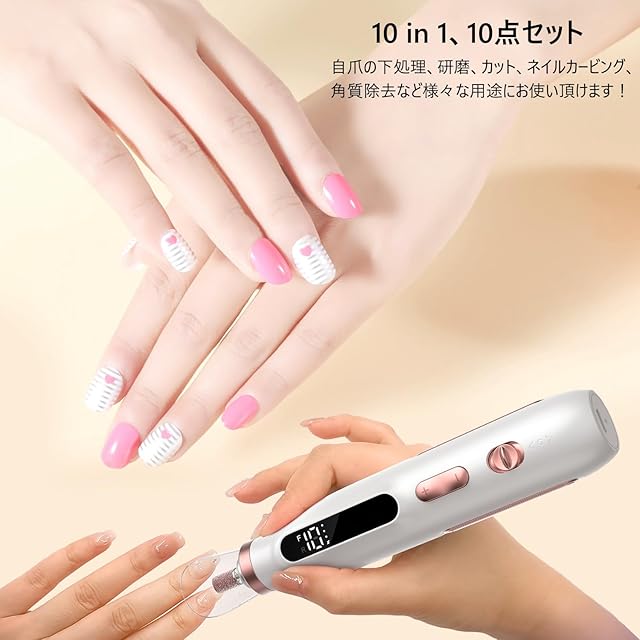 電動ネイルマシン ジェルネイル/アクリルネイル対応 爪磨き・ネイルオフ・甘皮処理 低騒音低振動 家庭/美甲サロン適用 10段階スピード調整