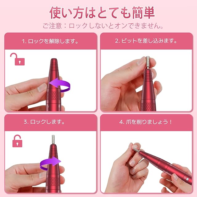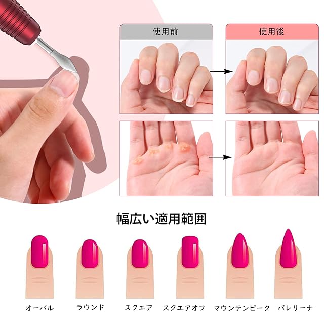 <p>豊富な機能を持って、初心者でも簡単にネイルケア</p> <p>手作業で10本の爪をケアするのはかなり大変。ネイルマシンがあれば、素早くキレイな爪に仕上げられるうえ、電動なので手が疲れにくいのも魅力です。自分でネイルのお直しをしたい人や、爪のケアをこまめにしている人は、使ってみる価値ありですよ!</p> <p>本体素材は安定感がある金属製</p> <p>金属製ので、適度な重さ・頑丈さにより振動が手に伝わりにくく、使用中にぶれる心配が少なくなります。初心者にもおすすめですよ。</p> <p>コンパクト&携帯便利</p> <p>鉛筆のようなスマートな形状で手に持ちやすくしっかり、持ち運び便利です。</p> <p> 【ネイルケアの下準備はこれネイルマシン一台にお任せ】11個の交換可能なビットと66個のサンディングバンドを付属しており、爪の下準備、研磨、カット、ネイルカービング、角質の除去のためにお使いいただけます。<br> <br> <br> 【コードレスで持ち回し便利】コンパクトなサイズで外出や旅行や出張にもネイルケアセット持っていけて安心で便利です!コードレスで場所を選ばず、どこでもお使いいただけます。<br> <br> 【スピード(0~20000rpm) & 時計/反時計回りの方向を調整可能】スピードコントロールダイヤルにより0-20,000 rpmの範囲で調整できます。ネイルマシーンを使用中片手で回転スピードを自由に調整できます。右利きと左利きの両方が使いやすいように時計回りと反時計回りのスイッチがついています。<br> 【低熱 & 低騒音、人間工学に基づいたデザイン】ネイルオフマシーンが高品質アルミ合金製のため、効率的に熱を放散することができます。また衝撃を吸収できるベアリングにより騒音と振動を低減します。低騒音&低振動の特性のため、使用中は非常に静かで振動が少ないです。長時間の使用による手の不快な痛みを防止します。人間工学に基づいたデザインで手にぴったりとフィットし、簡単に快適な体験をお楽しみいただけます。</p>