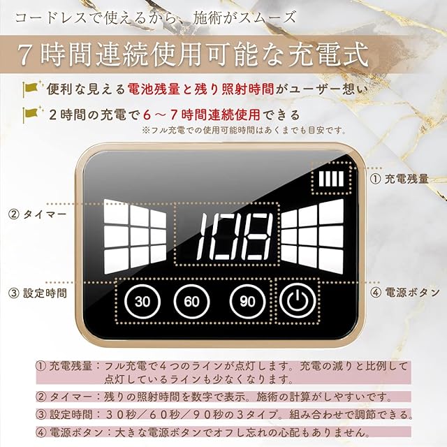 【ご使用上のご注意】※1ご使用する前にお持ちのジェル製品がワイプタイプかノンワイプタイプかをご確認ください。ワイプタイプの場合には硬化後も未硬化ジェルが残ります。またノンワイプタイプの場合でもジェル製品のメーカーと異なるライトの場合ワイプする必要がでる可能性がございますのでご確認の上ご使用をお願いいたします。 ※2 ネイルライトの照射部分(ランプビーズ部分)は非常にデリケートです。落下等強い衝撃を与えないよう十分ご注意の上、ご使用ください。 また故障の原因となりますため、除光液を使用したり素手で触ったりしないでください。 ※3 本製品は充電式の為、リチウムイオン電池が内蔵されております。リチウムイオン電池は充電回数によって消耗が激しくなりますので、不要な充電はお控えください。(充電残量が高い状態で充電するなど)尚、上記注意事項に記載する内容が要因となって本製品の故障に繋がった場合には保証の対象外となります。ご注意下さい。