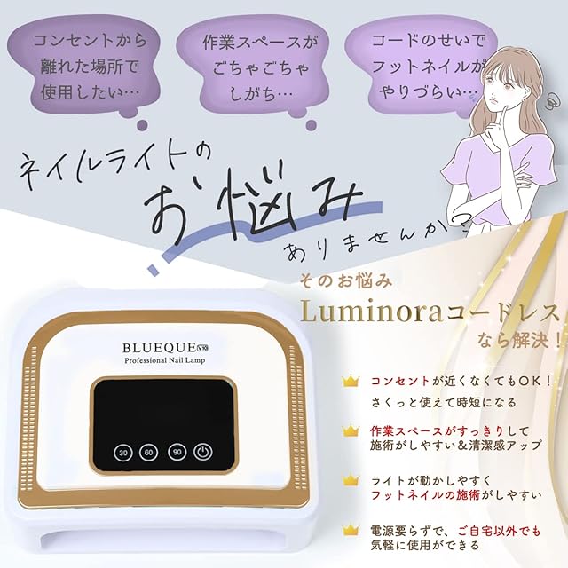 【プロも太鼓判】Luminoraコードレスはプロネイリストの監修商品。プロの目線から見ても太鼓判のサロンクオリティな商品です。サロンワークにも問題なくご使用いただけます。