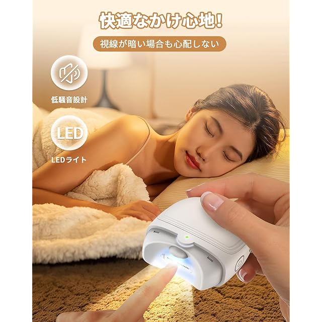 【多機能!暗闇でも安心して使えるLEDライト·低騒音設計】お客様にはよい使用体験をあげることは、こちらが貫いてきた理念であり、BOOMAX電動爪切りには指屑倉が付属しており、使用中に絞り出された爪屑を自動的に収集することができ、爪屑をむやみに飛ばせることはありません。また、当社では高齢者の視力の悪さや暗い環境での使用を考えて、本体の上に補助LED照明を搭載しており、夜でも一人暮らしの高齢者が安心して使用できるとともに、BOOMAX電動爪切りの素材自体に防音機能が備わっているので、邪魔になる心配はありません。
