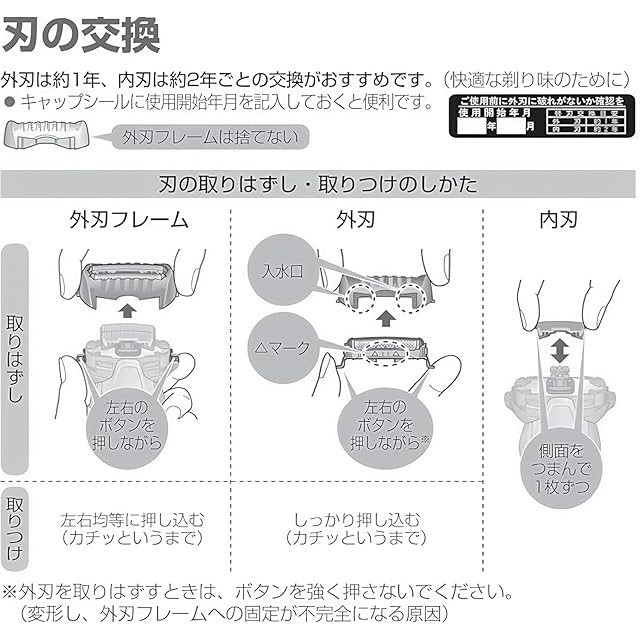 ステンレス製です。 刃はとても鋭いです。 通常の状態で外刃は約1年、内刃は約2年が交換の目安です。快適な剃り味を維持していただくために、期間内の交換がおすすめ