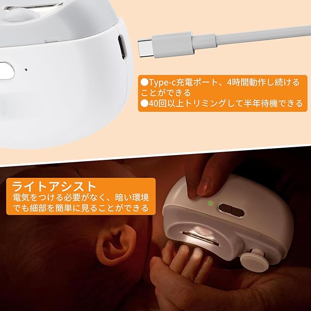 【安全安心】回転刃部分に爪を押し当てるだけなので、子供/お年寄り誰でも簡単にお使いいただけます。深爪にならない安心設計!!チャイルドロック機能がついているので誤って起動することがありません。LEDライト搭載で手元が見やすく安心。