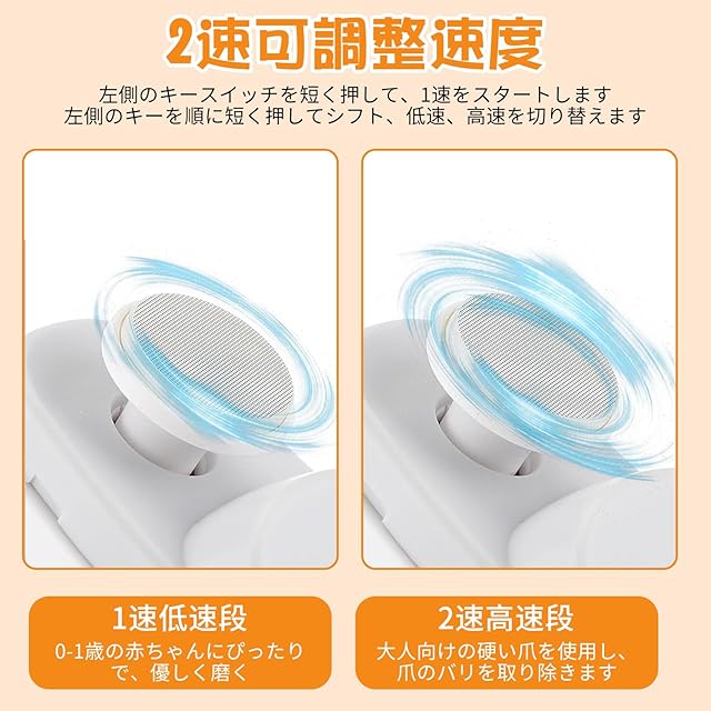 【2段階の調速機能】この電動爪切りは、2段階の調速機能を備えており、個々のニーズに合わせて調整することができます。爪の硬さや長さによって、切るスピードや力を調節できます。自分に最適なネイルケアを実現するため、使いやすさと効率性を備えた便利な製品です。日々のネイルケアをより快適で簡単に行いたい方におすすめです。