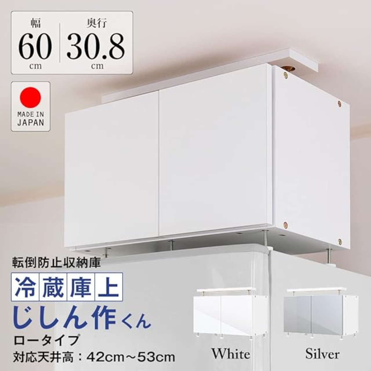 (JAJAN)[ 国産 ] 冷蔵庫専用 耐震上置き 【冷蔵庫上 じしん作くん】 ロータイプ ホワイト 対応隙間高42-53cm 幅60cm 奥行き30.8cm [ 鏡面扉 キッチン ][ 冷蔵庫上収納 隙間収納 すき間 ][ 転倒防止 地震対策 耐震 収納 ]IBJ-60LW | ascend
