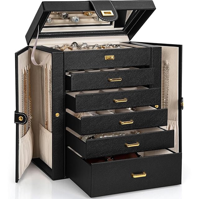 大容量、6つの万能な引き出しが付いたこの黒い大きなジュエリーボックスには、リング、イヤリング、ネックレス、チェーン、ブレスレットなどの多くのジュエリーアクセサリーを収納できます。 サングラス、時計、大きなジュエリー用に設計された1つの深い引き出し。