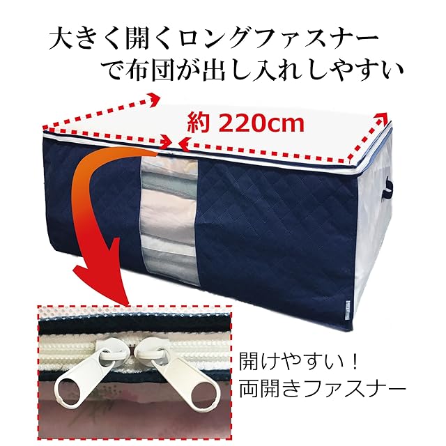 【大きく開くファスナー】上部に大きく開くファスナー付きでかさばる布団も出し入れしやすい!大きめのファスナーを使用し更に使いやすく。