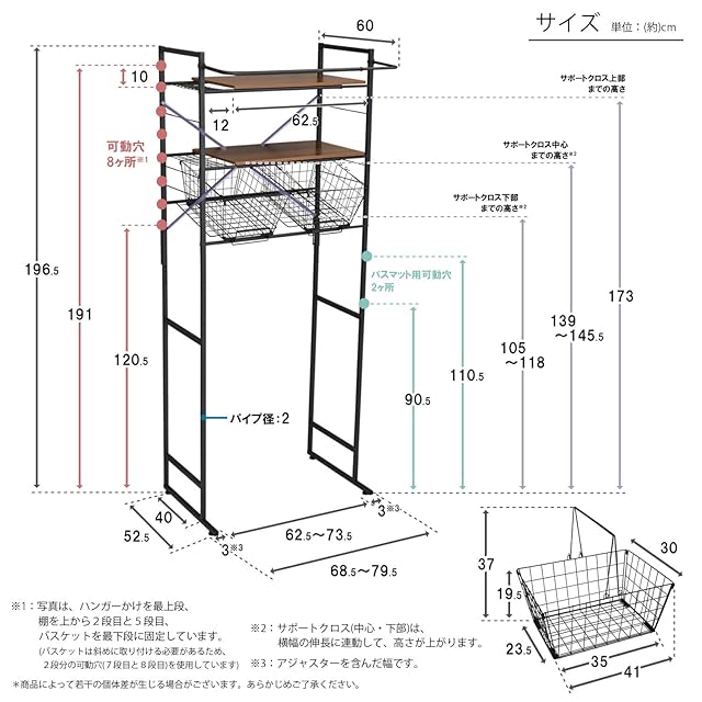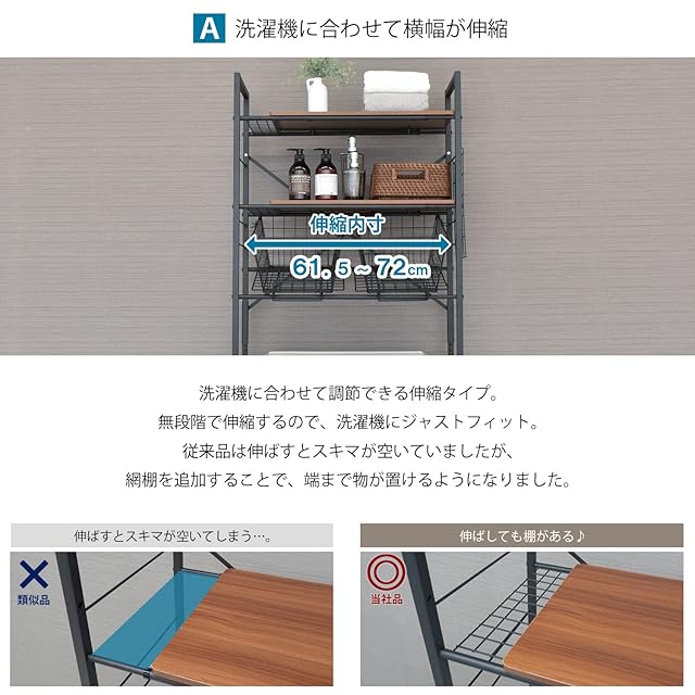 横幅自在の伸縮機能: 幅65.5-80cmで、棚がありますので小さい物も安定して置けます。