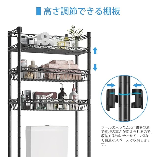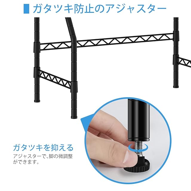 ✔高さ調節できる棚板:ポールに入った2.5cm間隔の溝で棚板の高さが変えられるので、収納する物に合わせて。レダなく最適なスペースで収納できます。