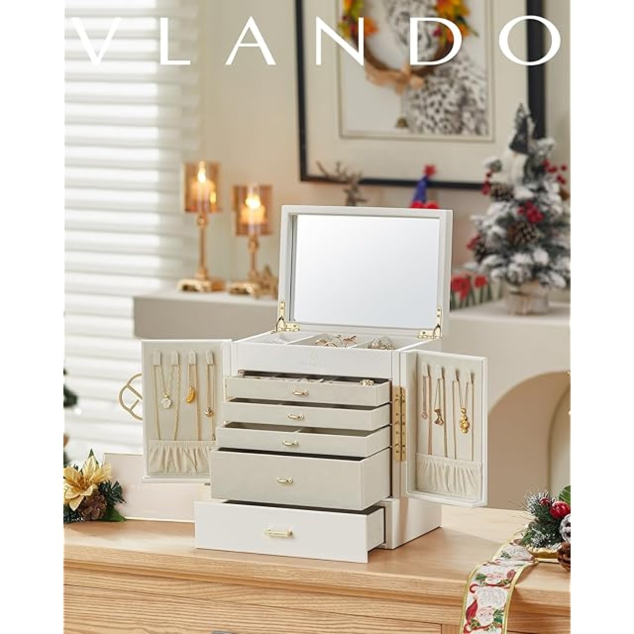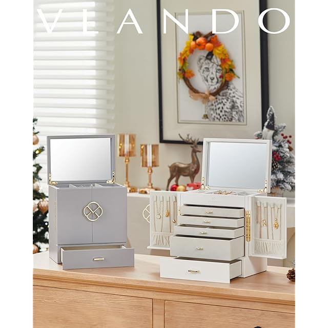 【6層&4段引き出し】 - Vlando 6層ジュエリーボックスは、異なる仕切りとレイアウトを持つ複数の層があり、すべてのジュエリーを整理して収納できます。4段の引き出しは、サイズの異なるジュエリーを収納できる異なる仕切りがあります。