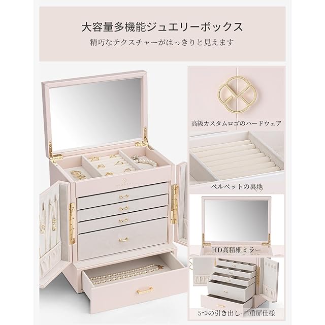 Vlando ジュエリーボックス 大容量 アクセサリー 木製 レザー 小物入れ 収納 隠れた収納スペース 引き出し 仕切り ジュエリー収納ケース プレゼント 女性 誕生日 (ライトピンク) | ascend