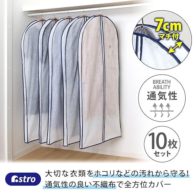 アストロ 衣類カバー マチ付きで厚手衣類対応 ロングサイズ 10枚組 吊り下げたまま使えるゆったりシワになりにくいマチ付き洋服カバー 通気性の良い不織布がホコリなどの汚れをガード 底閉じ仕様で舞い上がるホコリやダニなども防ぐ 防虫剤ポケット 透明窓 センターファスナー コートカバー 衣装カバー 吊り下げ収納 ホワイト 110-74 | ascend