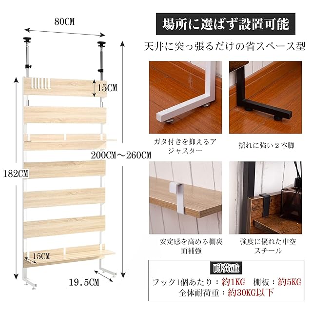 【本体サイズ】(約)幅80×奥行19.5×高さ200~260cm 【材質】本体:プリント紙化粧繊維板 脚部 フック:スチール(粉体塗装)つっぱりパイプ:スチール