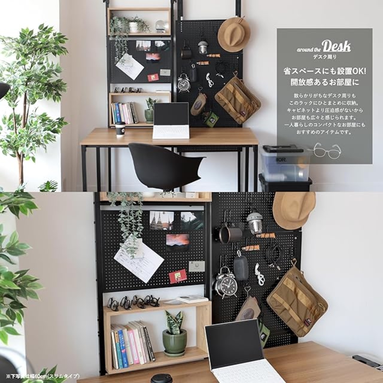 【棚板・有孔ボードの位置調節可能】収納物に合わせて棚板・有孔ボードの位置調節や増減が可能です。棚板2枚、有孔ボード1枚は移動や取り外し可能で、自分の好みの位置に棚を設置し、自分だけのオリジナルな壁面収納空間を作り上げましょう。空間を無駄なく使って収納できます。