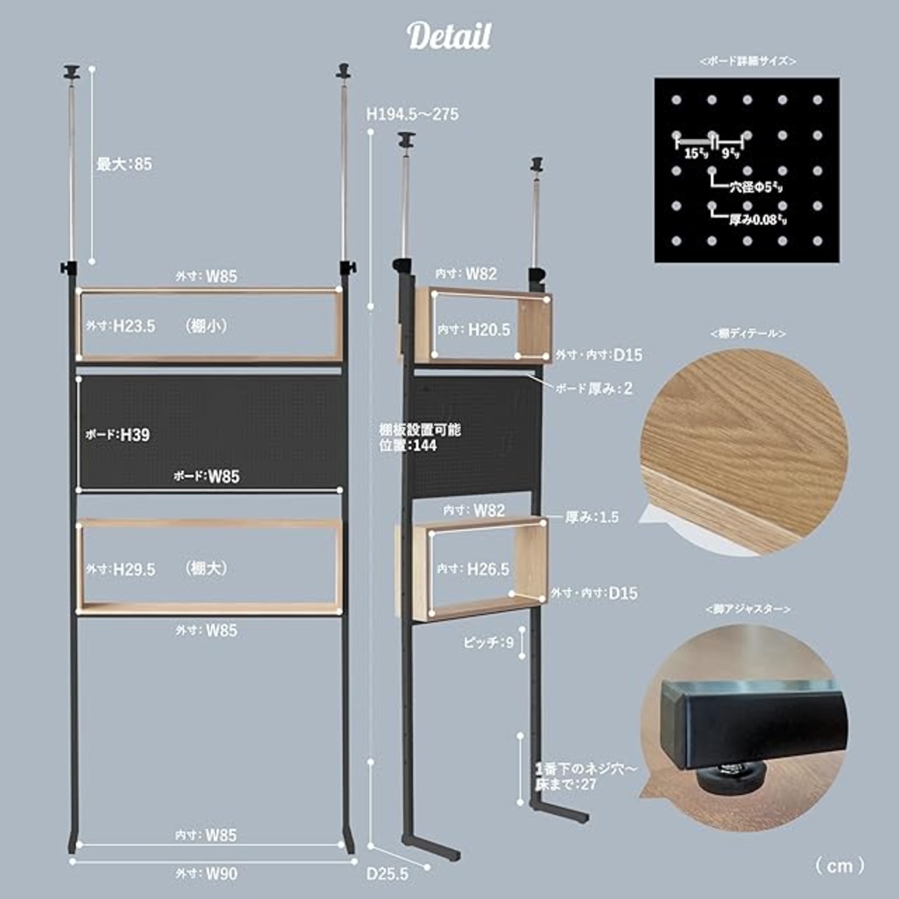 【幅90cm本体サイズ】:幅90cm突っ張りラックの商品仕様:幅90cm×奥行25.5cm×高さ194.5-275cm 。素材:スチール,MDF / 重量:14kg / 耐荷重:合計15kg 棚1つにつき5kg。ペグフック3個、マグネット3個。