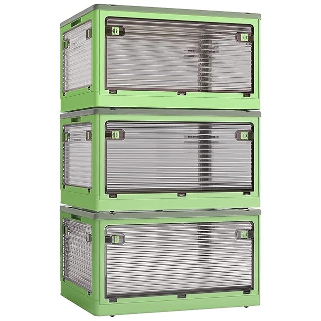 タマトシ 収納ボックス 全方向から取り出せる 透明 蓋付き 折りたたみ式 大容量 防災 収納ケース 積み重ね可能 衣替え 洋服 非常食 地震対策 避難用 防災グッズ収納 グリーン3個セット Mサイズ | ascend