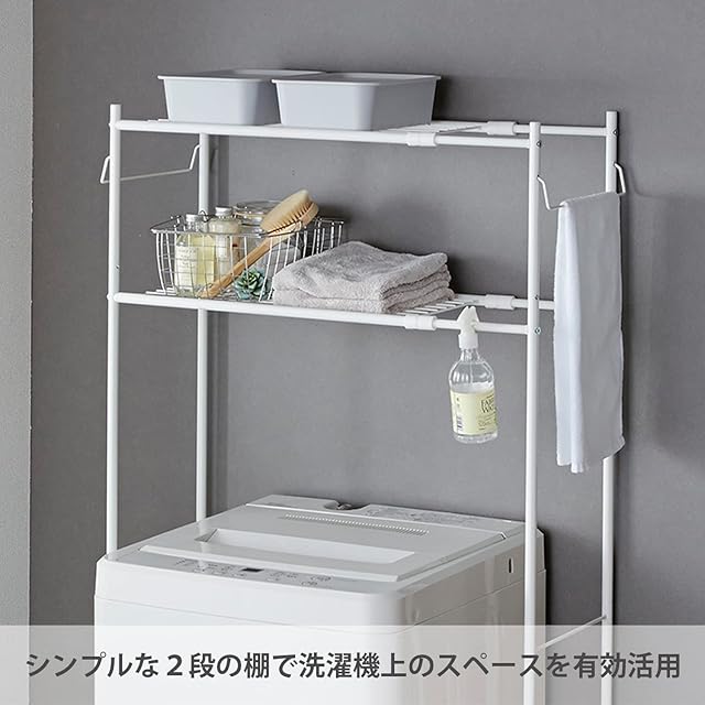 インテリアに馴染むマットな質感。細めのパイプを使用したスリムな洗濯機ラック。シンプルな2段の棚で空間を有効活用できます。