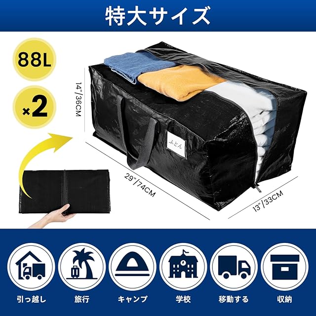 88L大容量、収納力抜群:抜群な特大引越しバッグの寸法:74 cm * 36 cm * 33 cm、2パック。 両端のジッパーと中央に大きな開口部があるため、衣類、おもちゃ、靴、タオル、必需品、枕、寝具、シーツ、毛布、洗濯物、クリスマス飾りなどを簡単に収納できます