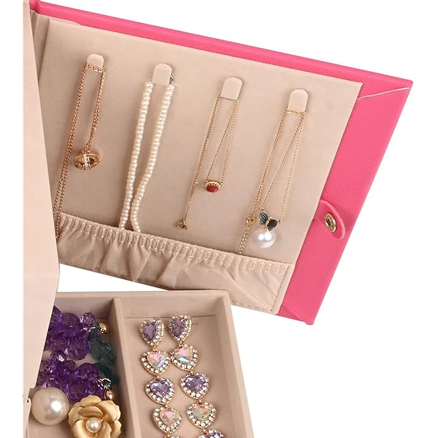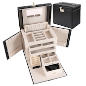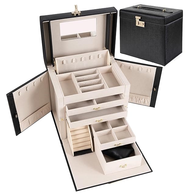 多重スペース構造、4層引き出し、両側にバタフライ式ネックレス袋、扇形のリング溝 高品質PU+PVC二重の本革を使用して、通常の革よりも2.5倍長寿命であり。美しいクロス模様のデザインによく合って、耐磨耗性と美しさ、質感を明らかに示します。