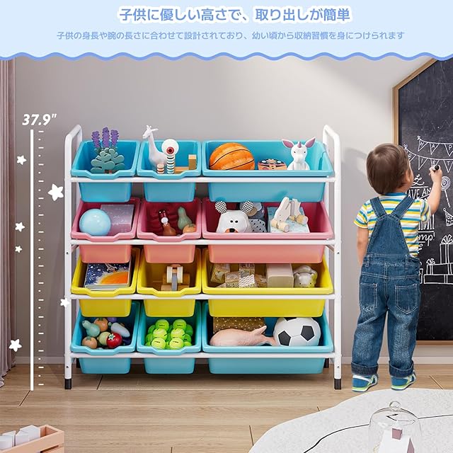 【大きな収納スペース】おもちゃ収納は標準サイズ8個と大型サイズ4個(標準サイズの8個分の容量に相当)の交換可能な収納箱があり、ぬいぐるみ、ボール、おもちゃのトラックなどを収納できて、大きな収納スペースを提供します。おもちゃを分類して収納すれば、お部屋がきれいになります。