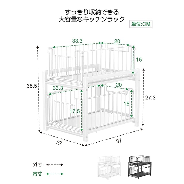 【シンク下 収納 スライド商品仕様】サイズ全体:幅27×奥行37×高さ38.5cm 引き出し×2(内寸):幅20cm×奥行33.3cm×高さ15m 上段から下段:17.5cm/材質:フレーム・引き出し・パイプ :炭素鋼/重量:約2.2kg/2色展開:ホワイト/ブラック/耐荷重:引き出し一個約15Kg 総耐荷重30Kg