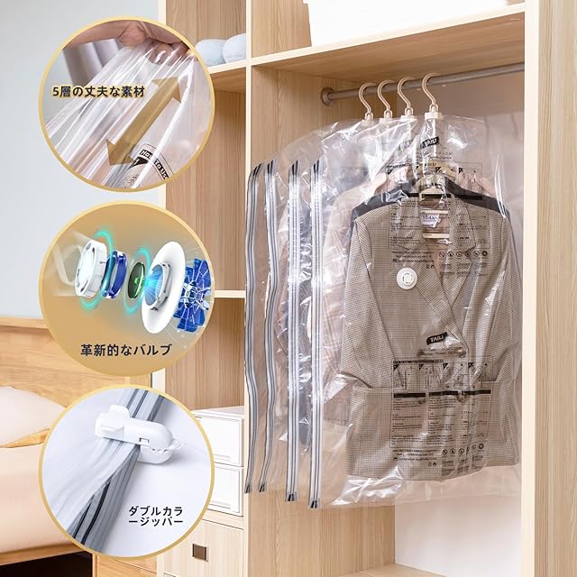 使いやすい:5フック設計により、1枚のバッグに男女問わず5着のジャケットを収納できます。ドレスやオーバーコートも収納できます。圧縮袋にはダブルカラージッパーを採用し、スライダを装備し、ファスナーのシールを容易にし、色の変化によりファスナーが完全にシールされているかどうかを迅速に検査することができます