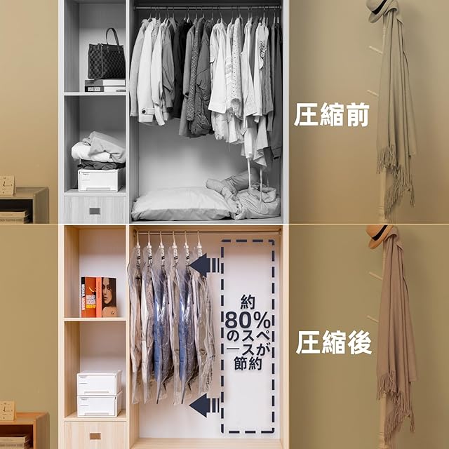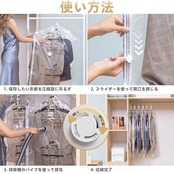 スッキリ収納:クローゼットに吊るして、衣類をすっきり収納できます。ジャケット、コート、洋服、スーツなど、散らかりやすい衣類をすっきり収納できる便利な吊り下げ式真空圧縮袋です。 ハンガーで、クローゼットに吊り下げて、服と一緒に管理できます。収納圧縮袋使わない時は折りたたんでコンパクトに収納出来ます