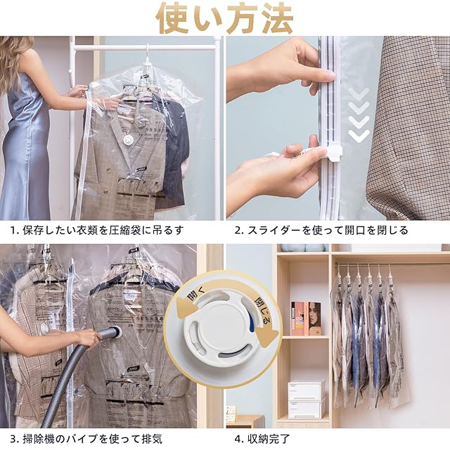 商品仕様:衣類圧縮袋サイズ:105*70 cm *2枚+ 135*70 cm *2枚。吊り下げ圧縮袋はオーバーコート、ジャケット、洋服など簡単に収め、収納スペースを省き、クロゼットの衣類をコンパクトに収納できます。縦スペースの利点を活かし、特にクローゼットの収納制限という問題を解決できます