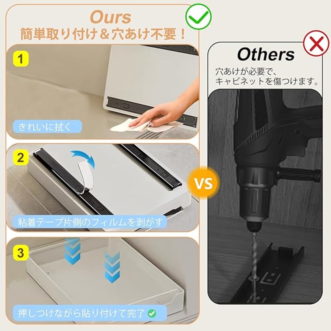 【簡単設置】付属のレールを使って収納カゴを簡単に設置。下をくっつける部分があり、貼り付けると引き出しになるのでとても便利です。