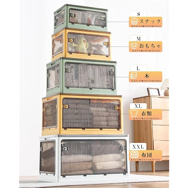 【5面開閉式×大容量収納】 「衣類/おもちゃ/布団収納に最適」 5面開閉式収納ボックスはどこからでも開けれるので詰める順番を考えずに、ポイポイ入れれるのが便利です。しかも大容量だから衣類やおもちゃ、布団まで色んな物がたっぷり収納できます。ボックスの天面に重い物も入れても、前、後、左、右から取り出せる可能です。一方向からしか取り出せない入れる伝統の収納ケースに比べて、使用頻度の低いものを取り出すのが不便になる心配はもうありません。こんな収納ボックスは本当に宝物です。