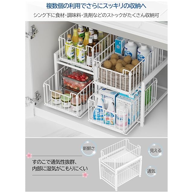 多機能ラック:シンク下はもちろん、調味料置くことも、洗面台下を置くことも、デスクの雑物や化粧品などは収納できます。奥のものが取り出しやすく、しまいやすいスライド式、スムーズに引き出せる、いろいろな場所に大活躍です。