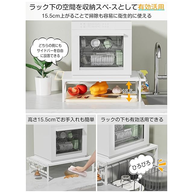 【ラック下17cmの省スペースで収納力アップ】ラック下に食器の一時置きもでき調理場が広々使える。高さは約17cm上がることで掃除も容易に衛生的に使える。狭いシンク食洗機が使いやすくシンクサイドにすっきりと、毎日の食器洗いもスムーズに。