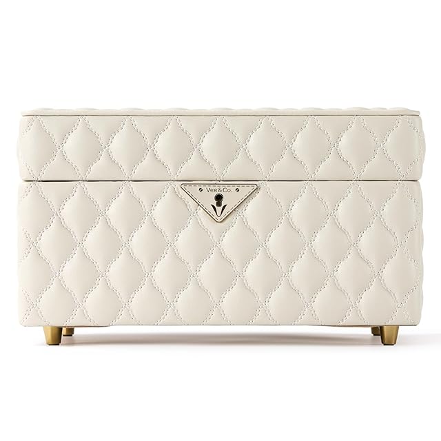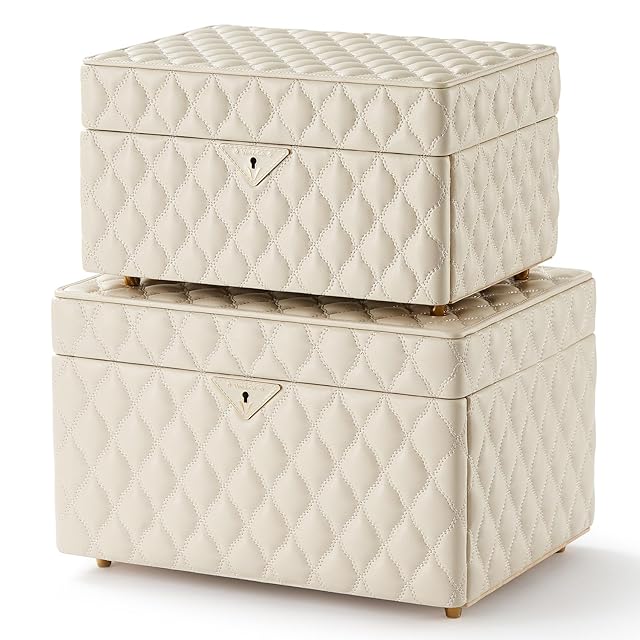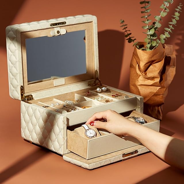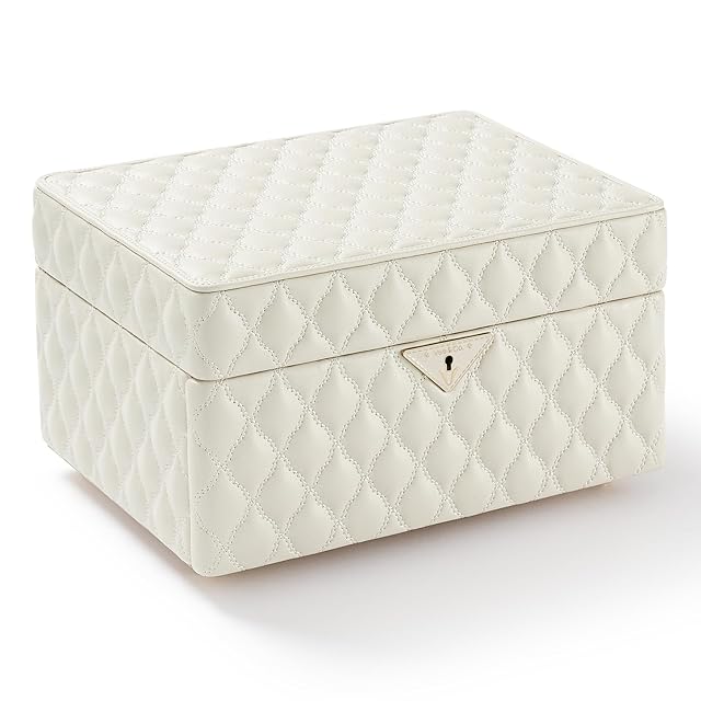 Vee&In.ジュエリーボックス、2層アクセサリーケース ダイヤモンドキルティングレザージュエリーオーガナイザー引き出し、大きなミラー付きアクセサリー 収納 キーロック付き多目的使用、ジュエリーの整理に最適,まともな贈り物 (ミディアム, ホワイト) | ascend
