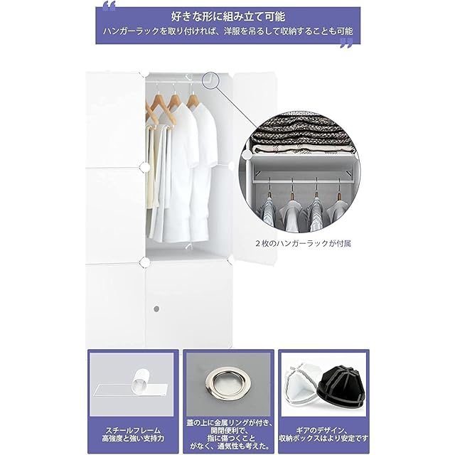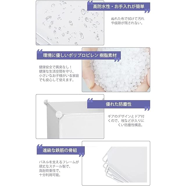 【防水・防塵・防カビ】①PP樹脂には特殊加工されたことで、表面が滑らかに見えます。水や汚れがついた場合、布で簡単にキレイに拭けて、痕跡が殘されなく、掃除にはとても便利です。②ギアのデザインとドア付くので、埃などが入りにくい防塵構造。③梅雨の時期に、または湿気がある場所でカビが生えにくくなります。④ワードローブのフタがしかっり閉まるように、マグネットキャッチが追加されました。※撮影状況や光の当たり具合、ご覧になる環境(PCのモニタやスマホの画面)などにより、色合いが異なって見える場合があります。【注意事項】棚板の静止耐荷重(約):10Kg(単個)、パネルカラー:高品質やや半透明のホワイト