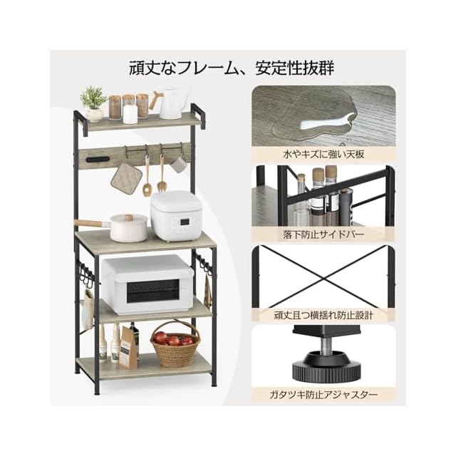 【安心安定設計&製品仕様】強度に優れたスチール製フレームとキズや水に強い素材メラミン化粧板を採用して、長く使用できるレンジ台である上、背面はクロスバーの補強で、レンジボード全体の横揺れを軽減して、脚部にアジャスターも付き、足の高さを微調整できており、平らでない場所でも安定してお使いいただけます。製品サイズ:奥行40×幅60×高さ130cm 耐荷重:1段目5kg、2段目25kg、3段目20kg、4段目25Kg。