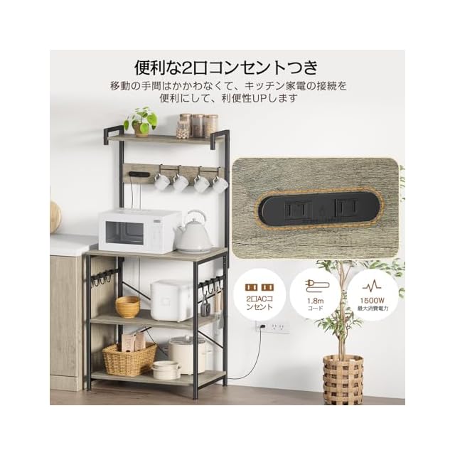 PRTONE キッチンラック レンジラック 食器棚 2口コンセント付き レンジ台 キッチン 棚 電子レンジ ラック 幅60 大型レンジ対応 高さ調整可動棚 レンジ棚 炊飯器置き台 省スペース S字フック アジャスター付き 奥行40×幅60×高さ130cm オーク | ascend