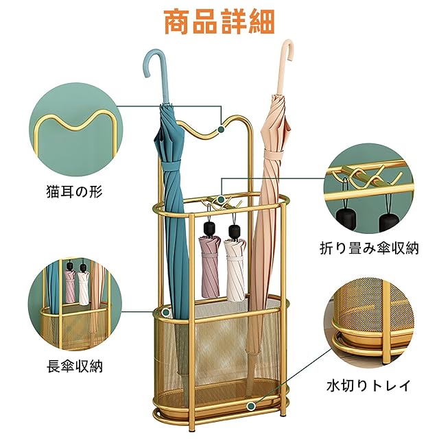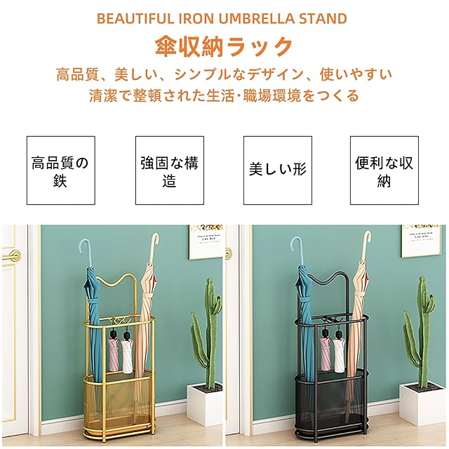 【製品情報】製品名:傘立て、素材:金属鉄、サイズ:30×15×60cm、色:ブラック、ゴールド。傘を集中的に収納できる傘立ては、使いやすく、収納にも便利で、清潔で整頓された生活・仕事環境を作ります。